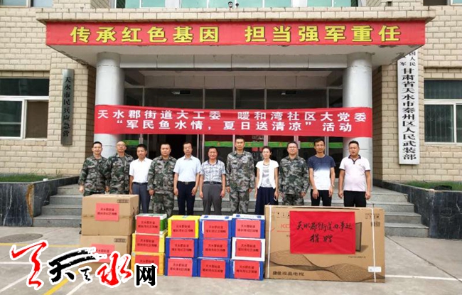 ????天天天水網(wǎng)訊 在“八一”建軍節(jié)來臨之際, 進(jìn)一步深入開展雙擁工作,落實(shí)各項(xiàng)優(yōu)撫政策,鞏固新時(shí)代的軍民關(guān)系。7月31日上午,天水郡街道大工委、暖和灣社區(qū)大黨委在秦州區(qū)人物武裝部開展“軍民魚水情,夏日送清涼”為主題的慰問活動(dòng)。