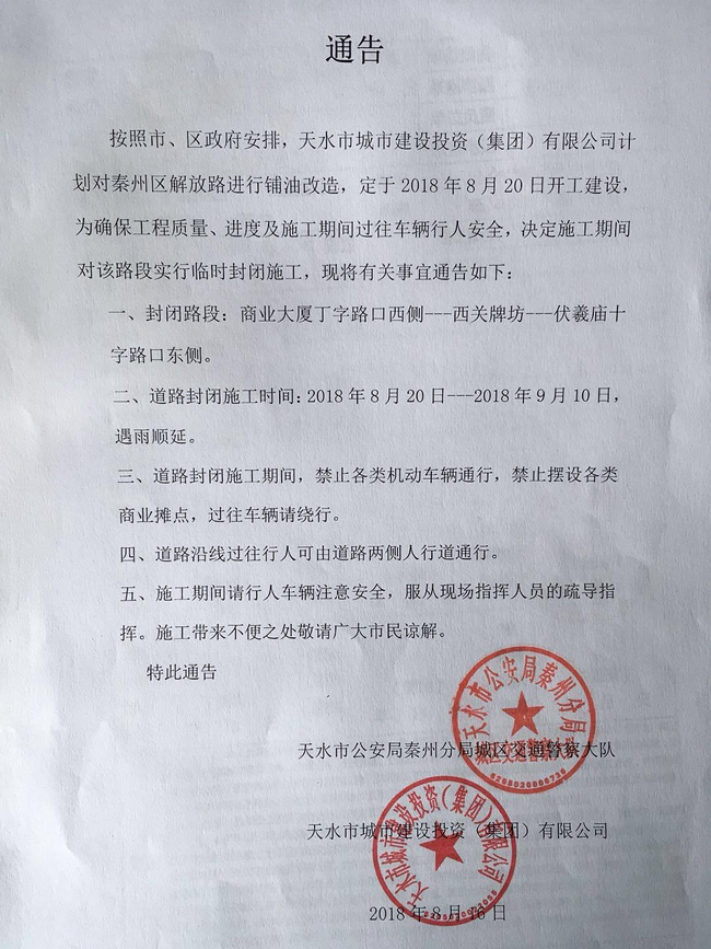 3.道路封閉施工期間,禁止各類機(jī)動(dòng)車輛通行,禁止擺設(shè)各類商業(yè)攤點(diǎn),過(guò)往車輛請(qǐng)繞行。