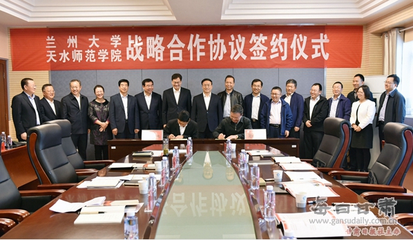 嚴(yán)純?nèi)A和安濤代表蘭州大學(xué)和天水師范學(xué)院簽署戰(zhàn)略合作協(xié)議。