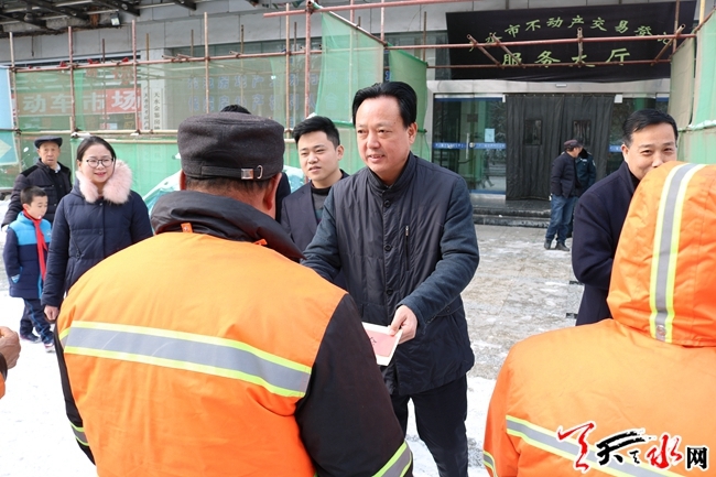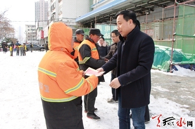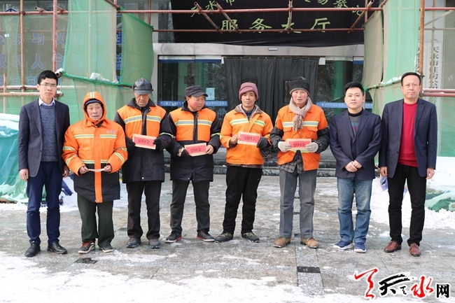 ????為了表示我們對環(huán)衛(wèi)工人的敬意,東關(guān)街道忠武巷社區(qū)大黨委立即號召轄區(qū)單位黨組織開展“送溫暖”活動,慰問環(huán)衛(wèi)工人,此舉立即得到市公積金中心黨總支的積極響應(yīng)。28日早上12時左右,市公積金中心黨組成員、黨總支書記、副主任楊志煒,黨組成員、副主任胡永平帶領(lǐng)班子成員和干部,走向街頭,看望慰問正在忙著除雪的環(huán)衛(wèi)工人。