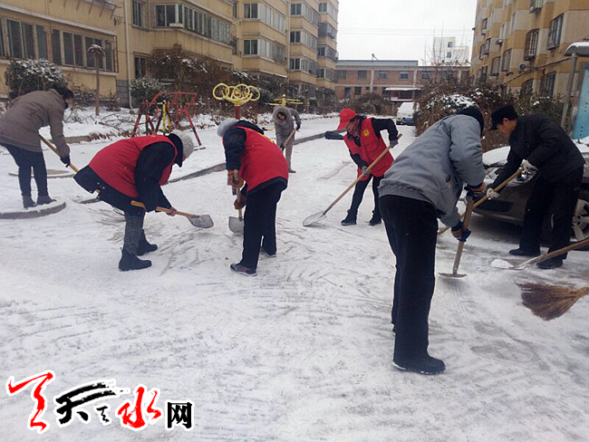 天天天水網(wǎng)訊(通訊員吳娟)12月27日,我市普降大雪,部分路面也開(kāi)始結(jié)冰,給居民們的活動(dòng)帶來(lái)很大的不便和安全隱患,12月28日一大早社區(qū)立即組織志愿者到小區(qū)內(nèi)開(kāi)展義務(wù)鏟雪活動(dòng)。志愿者們不畏寒冷,大家分工有序,配合默契,干勁十足,揮舞著除雪工具,雪水浸入鞋里,眼鏡片蒙了一層薄霧,然而這一切絲毫沒(méi)有影響大家高漲的掃雪熱情。小區(qū)內(nèi)的群眾也志愿加入進(jìn)來(lái),過(guò)往行人向志愿者投來(lái)贊許的目光。經(jīng)過(guò)一個(gè)多小時(shí)的勞動(dòng),小區(qū)內(nèi)的路面就被打掃干凈,為居民創(chuàng)造了安全的通行環(huán)境。