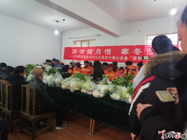 天天天水網(wǎng)訊(通訊員 王桂芳)在傳統(tǒng)節(jié)日臘八節(jié)前夕,蓮?fù)ど鐓^(qū)黨委聯(lián)系愛(ài)心企業(yè)“菜管家”為環(huán)衛(wèi)工人、社區(qū)老黨員、困難群眾、殘疾人共計(jì)40余人送上一份冬日的溫暖,大家一起共度臘八節(jié),喜迎新春佳節(jié)的到來(lái)。