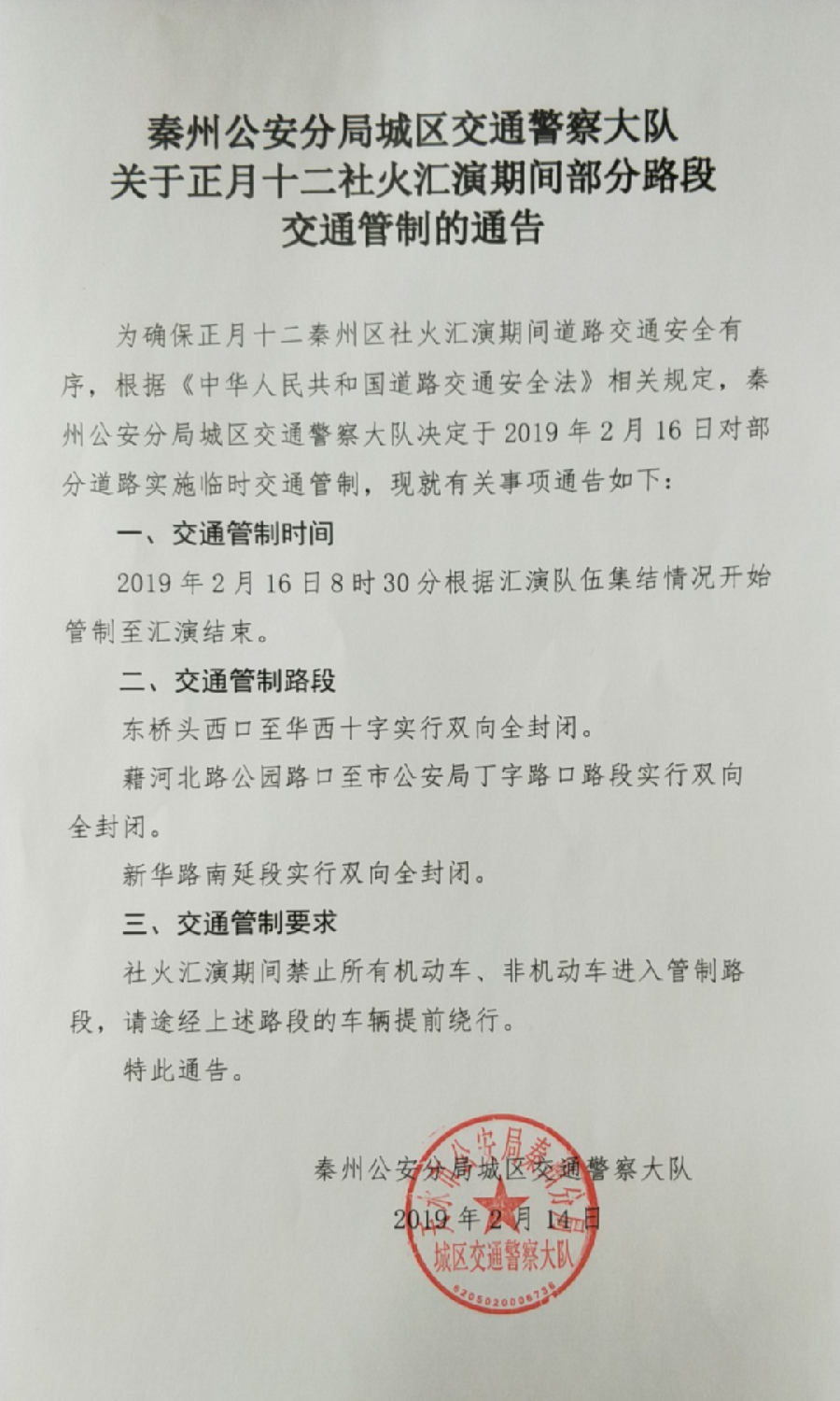 為確保正月十二秦州區(qū)社火匯演期間道路交通安全有序,根據(jù)《中華人民共和國道路交通安全法》相關(guān)規(guī)定,秦州公安分局城區(qū)交通警察大隊(duì)決定于2019年2月16日對部分道路實(shí)施臨時交通管制,現(xiàn)就有關(guān)事項(xiàng)通告如下: