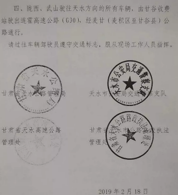 ?。ㄋ模╇]西、武山駛往天水方向的所有車輛,由甘谷收費(fèi)站駛出連霍高速公路(G30)經(jīng)麥甘(麥積區(qū)至甘谷縣)公路通行。