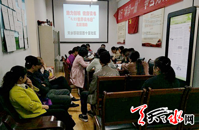 天天天水網(wǎng)訊(通訊員汪文惠)為倡導(dǎo)社區(qū)居民多讀書、讀好書,形成良好的社區(qū)文明風(fēng)尚,營造全民讀書、終身學(xué)習(xí)的良好社區(qū)氛圍,更好的助力創(chuàng)建文明城市,天水郡街道西十里社區(qū)利用圖書閱覽室的有利資源,組織轄區(qū)廣大居民開展“助力創(chuàng)城、健康讀書”4.23世界讀書日主題活動(dòng),全體社區(qū)工作人員及居民40余人參加了此次活動(dòng)。