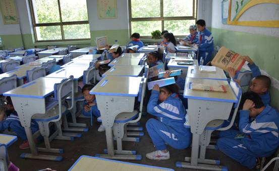 在第二階段長城中學活動現(xiàn)場,首先進行了避震演練,班主任介紹地震來臨時正確避險方法,當報警聲音響起,各班班主任發(fā)出“躲避地震”口令,學生聽到口令后雙手抱頭迅速鉆入課桌下,當警報再次響起,高年級學生進行消防疏散演習,在老師的帶領下有序的從教室疏散到操場,貓腰用小毛巾捂住口鼻行進,撤離出教學樓的學生到達操場集合地后迅速下蹲并作雙手抱頭姿勢,然后各班應立即清點人數(shù)。