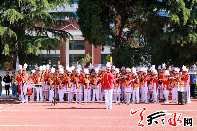 全體教職員工和學生興高采烈、意氣風發(fā)、精神抖擻地參加了運動會開幕式。在激昂的運動員進行曲中,甘肅工業(yè)職業(yè)技術學院國旗護衛(wèi)隊和天水市新華門小學管樂隊進行了莊嚴的升旗儀式,各班代表隊方陣喊著嘹亮的口號、伴著青春的舞步走進了運動場,初夏的校園到處飄揚著五星紅旗,充滿了恢弘的正能量。
