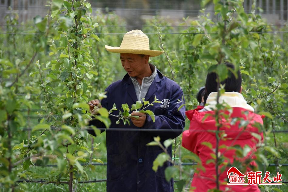 采訪團(tuán)第一站,來到了洛門牟坪現(xiàn)代農(nóng)業(yè)蘋果矮化密植示范園。站在園區(qū),目光所及皆是翠綠的蘋果樹。一排排整齊的低矮蘋果樹像一行行列兵,把守在漫山遍野。此刻,技術(shù)工人牟滿德正在檢查滴灌設(shè)備是否正常運行。記者們的鏡頭隨著牟滿德穿梭在蘋果樹間,看著他把一根根漏水的滴灌管道更換修理好。滿園的果樹,一片片嫩綠的枝葉間,幼小的果實已隱約可見?!斑@滿園的蘋果,就是村民奔小康的希望?!贬溽嘣诰G意盎然、花果累累的蘋果園中,牟滿德對未來充滿信心。