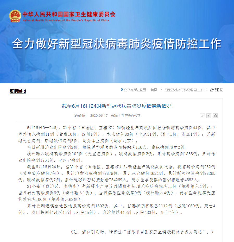 截至6月16日24時,據(jù)31個省(自治區(qū)、直轄市)和新疆生產(chǎn)建設(shè)兵團報告,現(xiàn)有確診病例252例(其中重癥病例7例),累計治愈出院病例78379例,累計死亡病例4634例,累計報告確診病例83265例,現(xiàn)有疑似病例7例。累計追蹤到密切接觸者754269人,尚在醫(yī)學觀察的密切接觸者4683人。