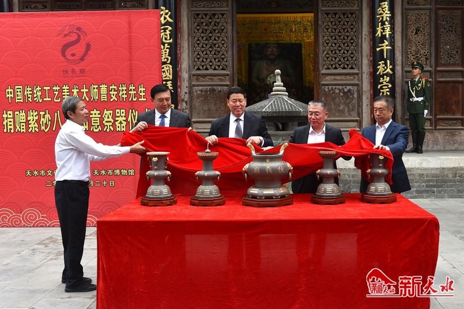 新天水訊【天水日?qǐng)?bào)記者郝勤學(xué) 周文濤】6月20日,中國(guó)傳統(tǒng)工藝美術(shù)大師曹安祥向伏羲廟捐贈(zèng)了“紫砂八卦如意祭器”,捐贈(zèng)儀式在伏羲廟舉行。