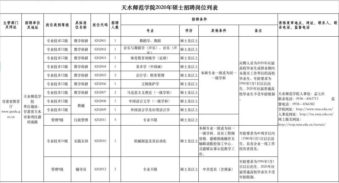 1.天水師范學(xué)院2020年碩士招聘崗位列表