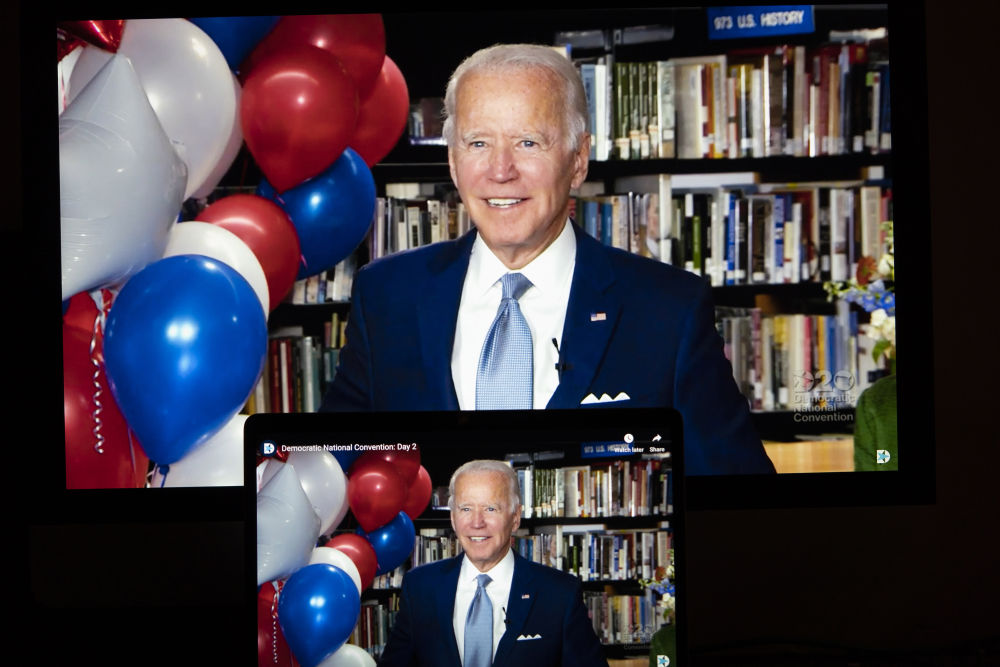8月18日拍攝的直播視頻畫面顯示,喬·拜登被提名為2020年美國民主黨總統(tǒng)候選人后慶祝。(新華社記者劉杰攝)