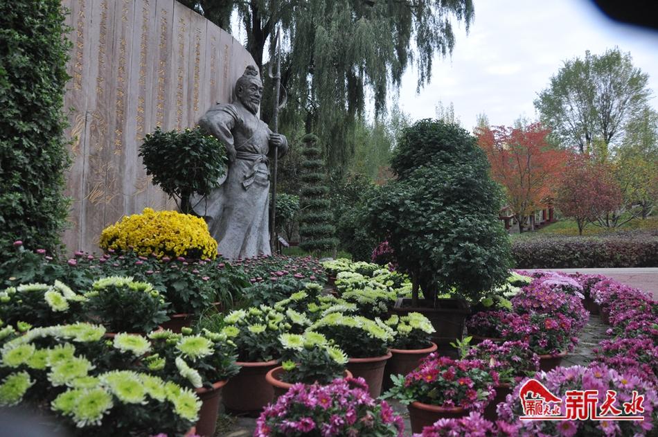 天一閣西邊緩坡上就勢是菊花的海洋,紅的、紫的、黃的、百的菊花依次由外向里一層一層的擺布,好一個(gè)菊花的世界。牧馬的秦非子也被菊花簇?fù)碇?,千年前,這位大秦帝國締造者的先祖也一定在放馬灘被漫山遍野的菊花所陶醉,在秋風(fēng)颯起的季節(jié)里,在菊花的香陣?yán)镆粔刈砭疲宦曢L嘯,劍指天狼,揮斥百萬黃金甲東向長安。