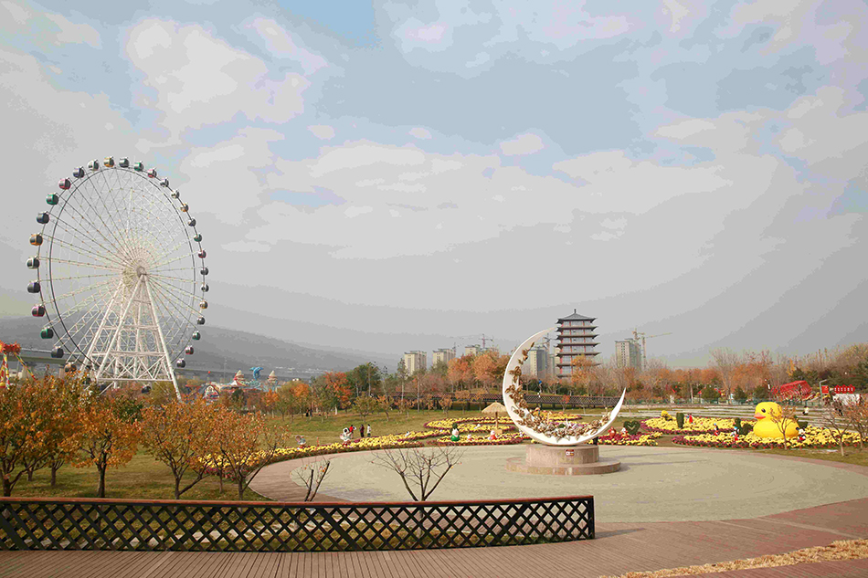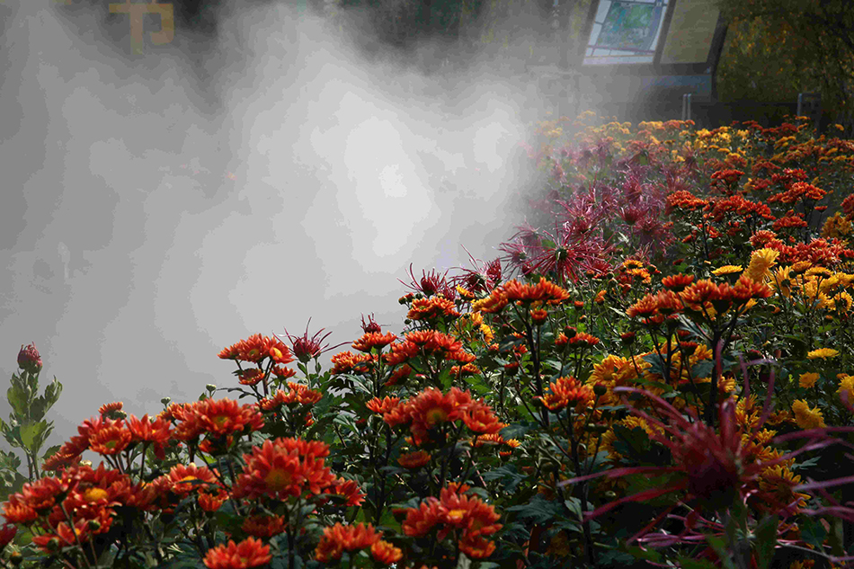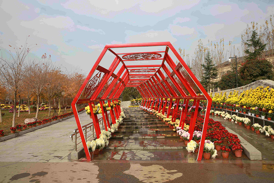 本屆菊花展在麥積區(qū)馬跑泉公園舉辦,展出時間為10月15日至11月15日(為期32天),布展面積1.7萬平方米,設(shè)置主題菊花景觀20余處,展出獨本菊、多頭菊、盆景菊、大菊、小菊、藝菊及時令鮮花32萬余盆?;ㄕ挂浴熬找鹎铩』ㄒ缣焖睘橹黝},本著生態(tài)、環(huán)保、節(jié)約的理念,將生態(tài)性、藝術(shù)性和以人為本的設(shè)計理念有機地融合在一起?;ㄕ挂怨珗@的四個主入口為切入點向園內(nèi)延伸,巧妙利用公園的廊、亭、臺、榭、橋等古典園林建筑和雕塑、景墻、水體等現(xiàn)代景觀元素,注重菊花品種、色彩、菊藝與菊文化的有機結(jié)合,在四個主入口、天一閣廣場周邊、婚慶廣場、南廣場、西廣場及園路兩側(cè)綠地設(shè)置以全面小康、人民幸福、民族團結(jié)、菊韻、超越夢想為主題的大型景觀節(jié)點,在大型景觀節(jié)點之間布置花壇、花鏡、花架、景墻等不同造型的中小型節(jié)點,節(jié)點之間通過不同花色的菊花花帶相貫通,讓游客身臨其境,感受菊景之美。同時,將公園的制高點和中心位置——天一閣廣場做為精品菊展示區(qū),擺放獨本菊、盆景菊、多頭菊、花樹菊等多個品種的精品菊,將花展再次推向高潮。整個花展采用綠色雕塑、植物仿生造型和立體花壇等多種形式,通過博古架、陶罐、皮影、竹簡、花船、花瓶等元素豐富造景內(nèi)容,并利用冷霧技術(shù)營造出煙霧繚繞的感覺,綠樹成蔭與泛舟湖上相映成趣,呈現(xiàn)給游人的不僅是一派繁花似錦的美麗景象,更是一場視覺上的花卉盛宴!