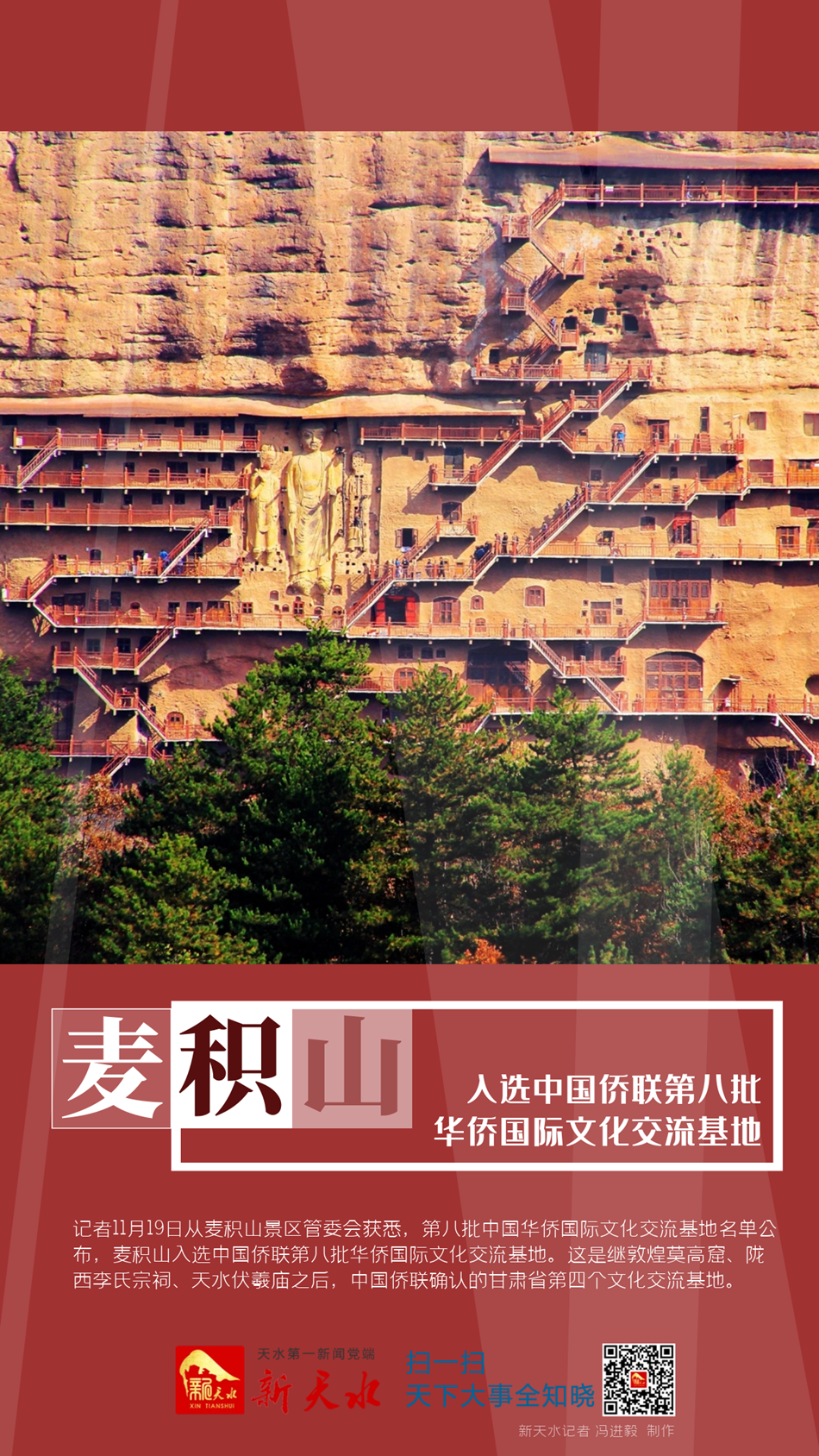 新天水訊【記者 黃虹】記者11月19日從麥積山景區(qū)管委會(huì)獲悉,第八批中國(guó)華僑國(guó)際文化交流基地名單公布,麥積山入選中國(guó)僑聯(lián)第八批華僑國(guó)際文化交流基地。這是繼敦煌莫高窟、隴西李氏宗祠、天水伏羲廟之后,中國(guó)僑聯(lián)確認(rèn)的甘肅省第四個(gè)文化交流基地。