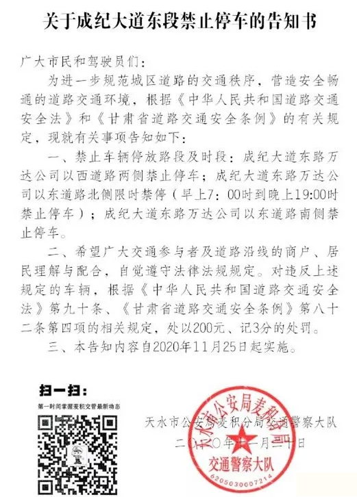 周知!11月25日起,成紀(jì)大道東段禁止停車