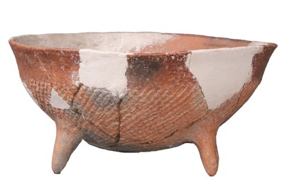 “大地灣遺址位于天水市秦安縣五營鎮(zhèn)邵店村,是一處規(guī)模較大、保存較好、內(nèi)涵豐富的新石器時(shí)代遺址,年代跨度為距今約7800年-4800年?!碧焖胁┪镳^館長李寧民說。1958年,一個(gè)農(nóng)民在邵店村清水河?xùn)|岸臺地犁地時(shí),發(fā)現(xiàn)了一只色彩斑斕、造型奇異的陶罐。這個(gè)不經(jīng)意的發(fā)現(xiàn),讓大地灣遺址進(jìn)入考古學(xué)者的視野?!按蟮貫臣扔蟹恐?,又有墓葬,出土了國內(nèi)年代最早的一批彩繪陶器和炭化的糧食標(biāo)本。我館收藏的寬帶紋三足彩陶缽,就是大地灣一期陶器,距今約7800年。”