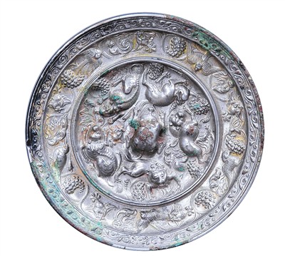 “唐代瑞獸葡萄紋銅鏡也是我們館藏的珍品?!崩顚幟裾f,葡萄是從西域傳入的物種之一,唐代時(shí)普及于中原,成為銅鏡上常見的紋飾。這面銅鏡采用高浮雕工藝,極具立體美感,是唐代銅鏡的杰出作品。瑞獸紋和葡萄紋都傳遞著美好的寓意,體現(xiàn)了中西方文化的交融。