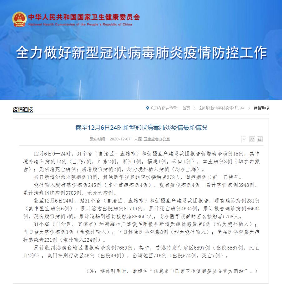 12月6日0—24時(shí),31個(gè)?。ㄗ灾螀^(qū)、直轄市)和新疆生產(chǎn)建設(shè)兵團(tuán)報(bào)告新增確診病例15例,其中境外輸入病例12例(上海7例,廣東2例,浙江1例,福建1例,云南1例),本土病例3例(均在內(nèi)蒙古);無新增死亡病例;新增疑似病例2例,均為境外輸入病例(均在上海)。