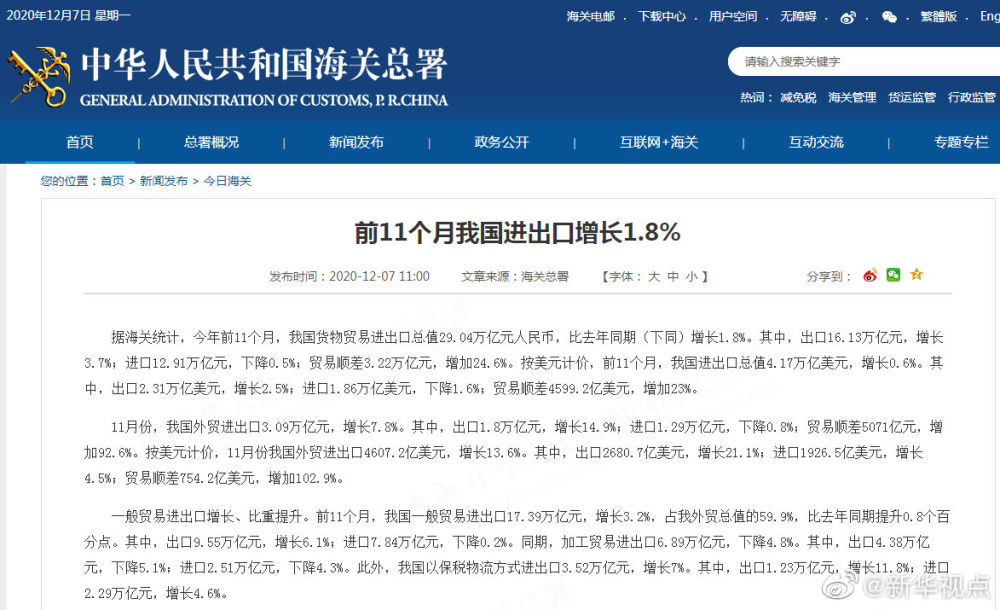海關(guān)總署7日發(fā)布數(shù)據(jù),前11個(gè)月,我國貨物貿(mào)易進(jìn)出口總值29.04萬億元,同比增長1.8%。這是繼1至9月外貿(mào)進(jìn)出口累計(jì)增速年內(nèi)首次轉(zhuǎn)正以來,連續(xù)第三個(gè)月保持正增長。給力?。ㄓ浾邉⒓t霞)