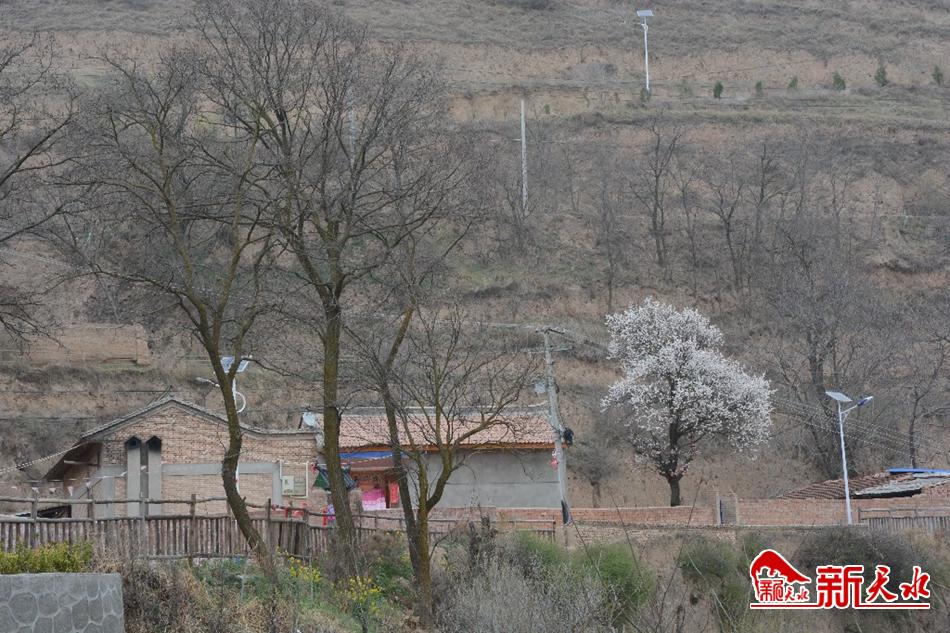 站在山梁與周山村的岔路口放眼望去,在山北的幾塊平展的臺(tái)地上,一座村莊沿著山灣東西展開(kāi),通村水泥路的兩邊柳樹(shù)翠綠,紅瓦與白墻相映成趣,崖畔、村邊早開(kāi)的杏花如同粉白的云朵環(huán)繞著村莊。
