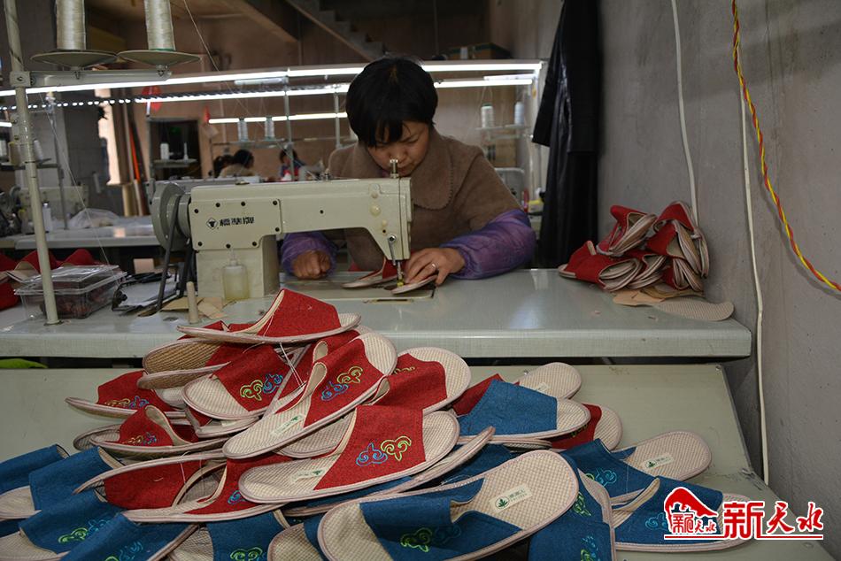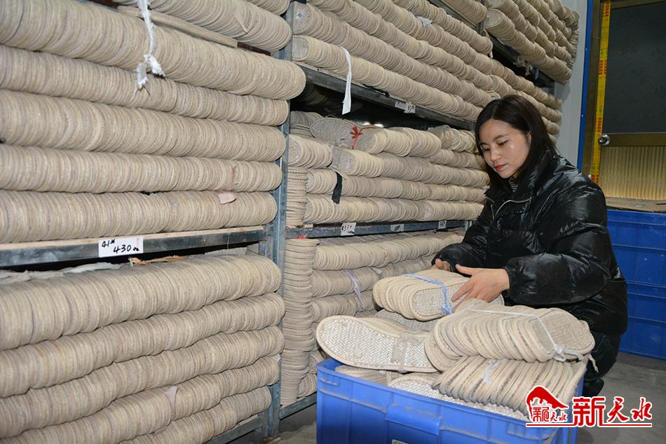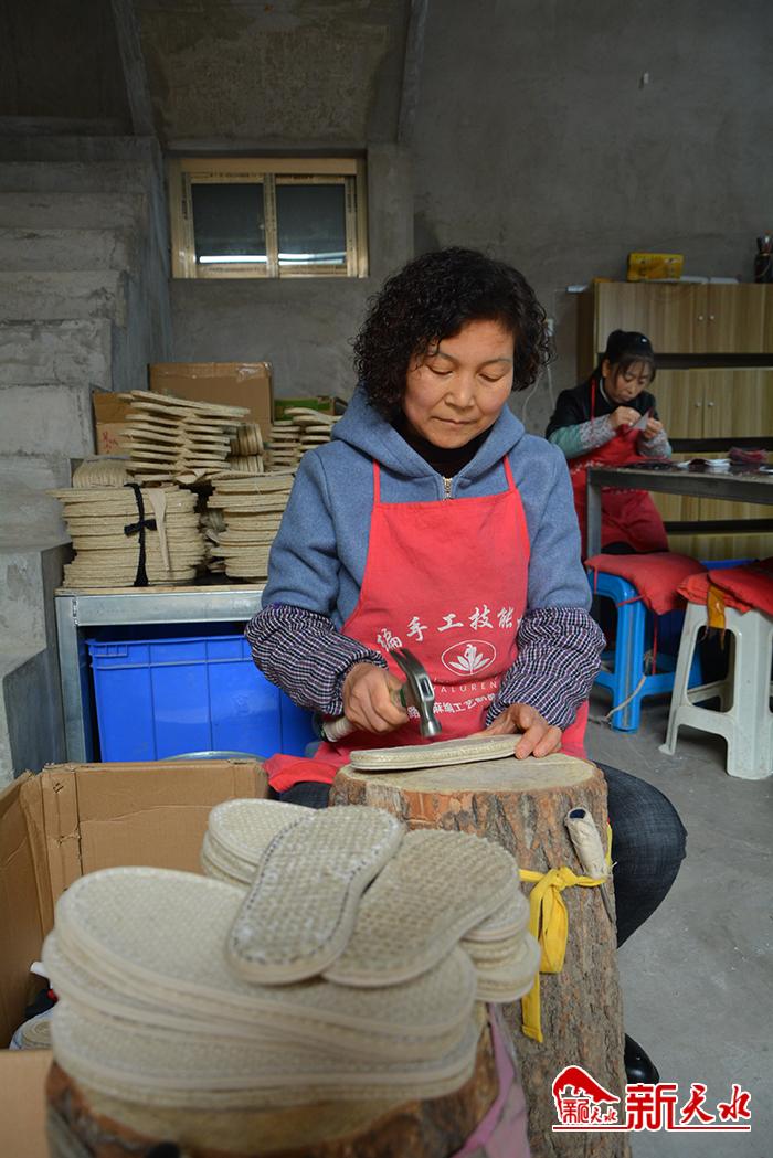 走進(jìn)制作車間,記者看到,工人們緊張有序地忙碌著,有的在用錘子敲打著麻編鞋底,有的在縫制鞋幫,還有的在往貨架上擺放剛加工好的鞋底。