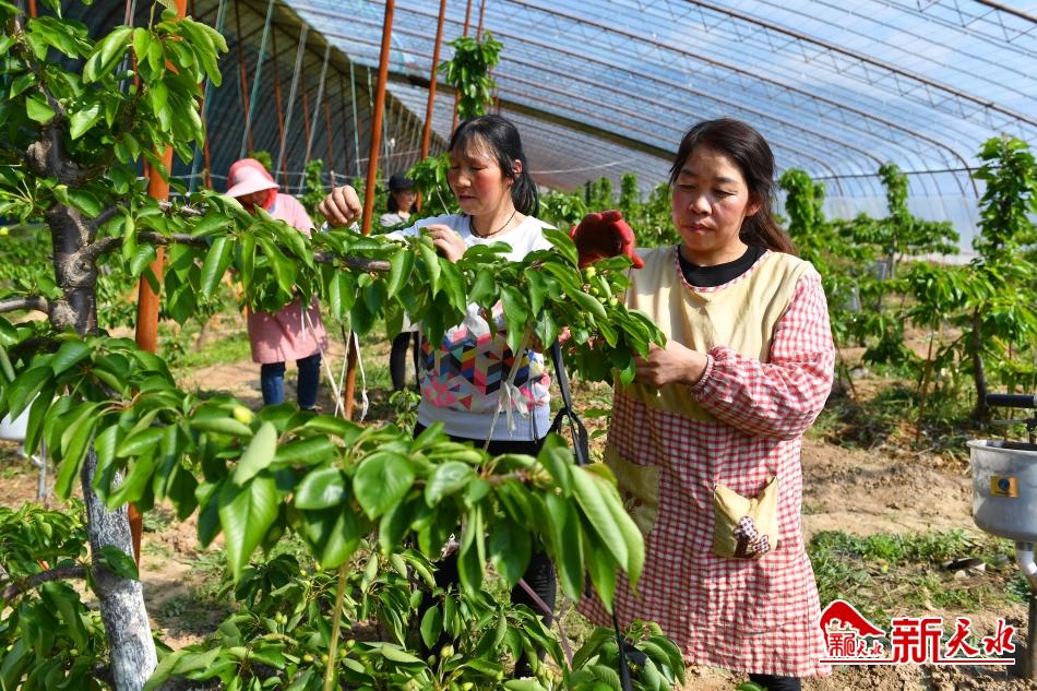 2月28日,在甘谷縣安遠(yuǎn)鎮(zhèn)鞏川村的設(shè)施櫻桃大棚里,幾名女工正在為櫻桃樹施肥。溫潤的大棚里,櫻桃樹翠綠的樹葉間,藏著顆顆大櫻桃,有的青綠,有的已經(jīng)開始發(fā)紅。據(jù)甘谷縣佳農(nóng)果蔬專業(yè)合作社的負(fù)責(zé)人介紹,預(yù)計3月10日左右,今年的首批大櫻桃將“搶鮮”上市。
