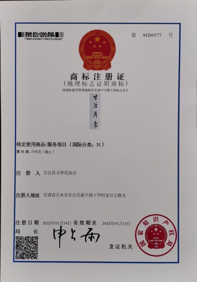 “甘谷月季”成功注冊國家地理標(biāo)志證明商標(biāo)