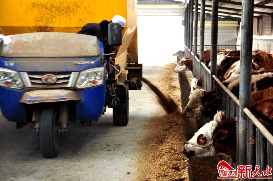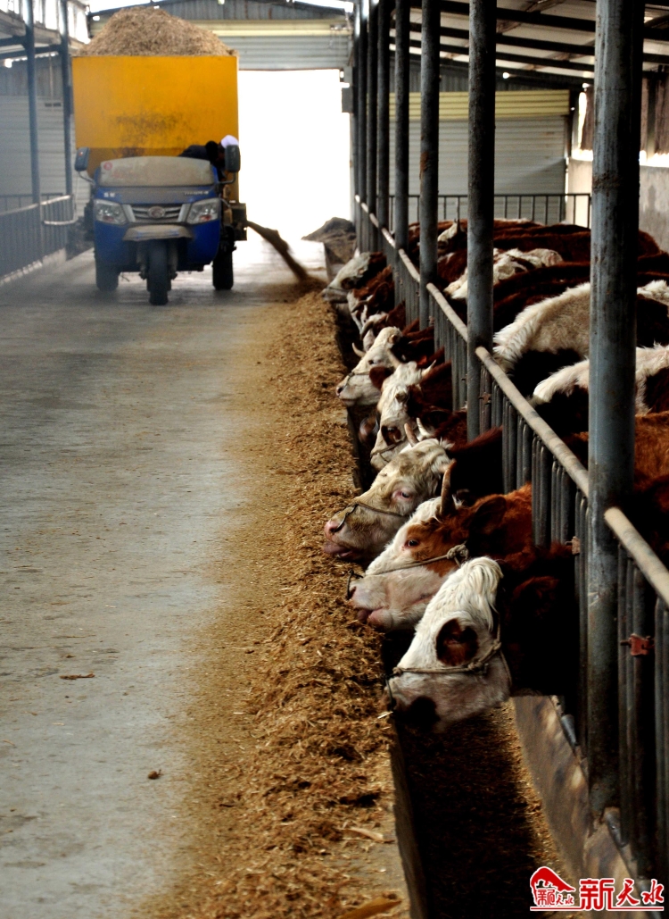 2月27日,位于清水縣黃門鎮(zhèn)臺子村的天水嘉泰牧業(yè)有限公司的牛舍內(nèi),飼養(yǎng)員正在用機(jī)械給牛投喂飼料。