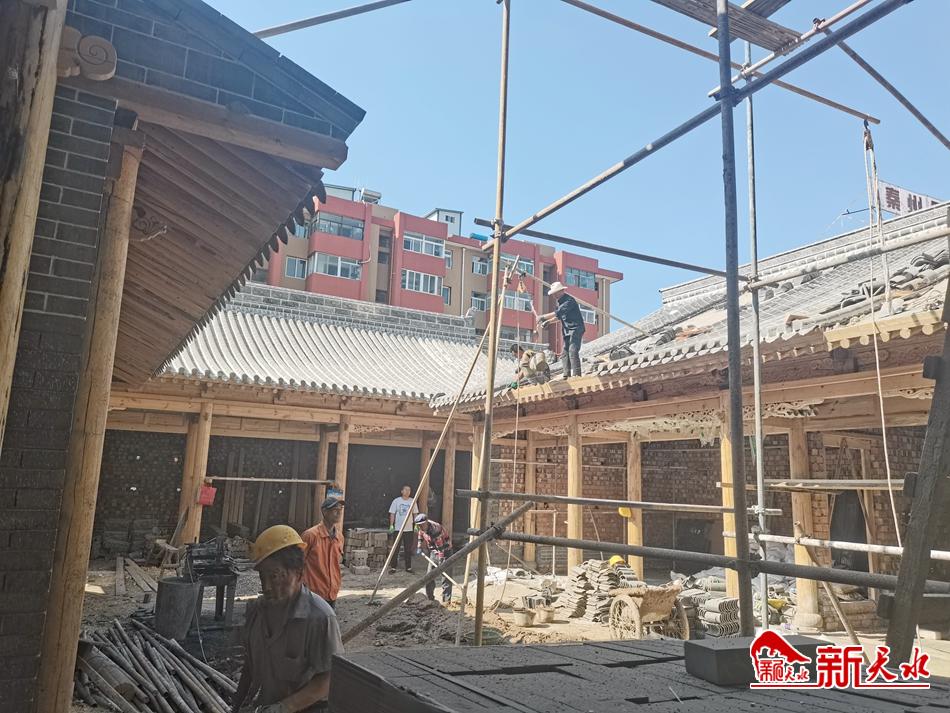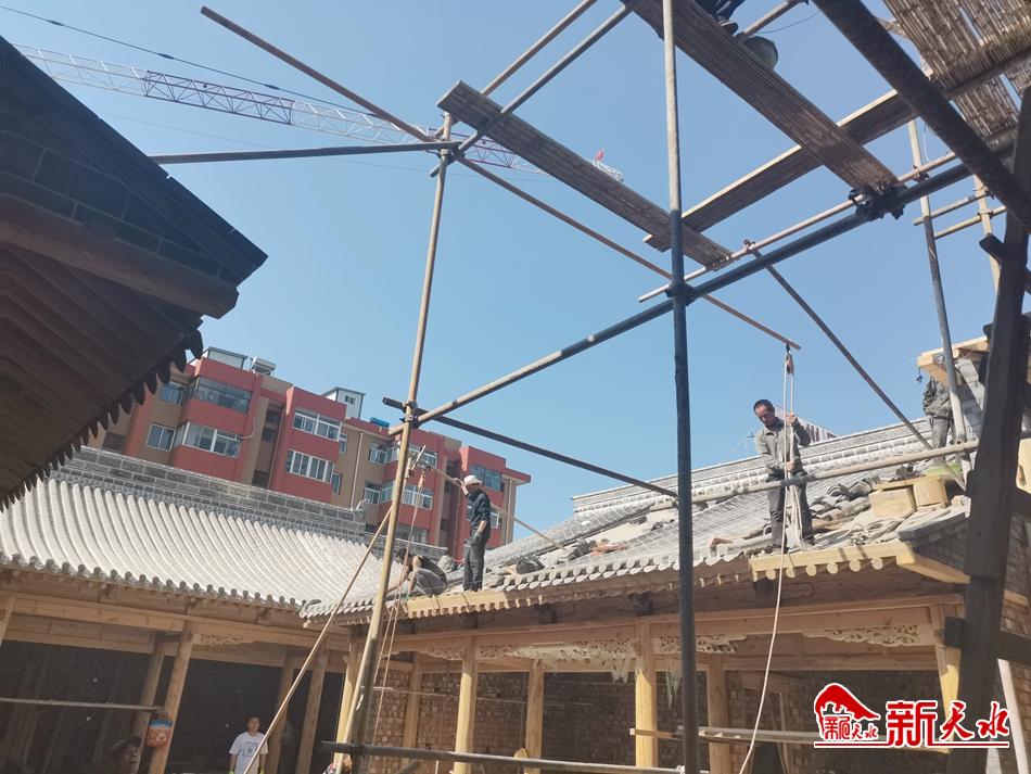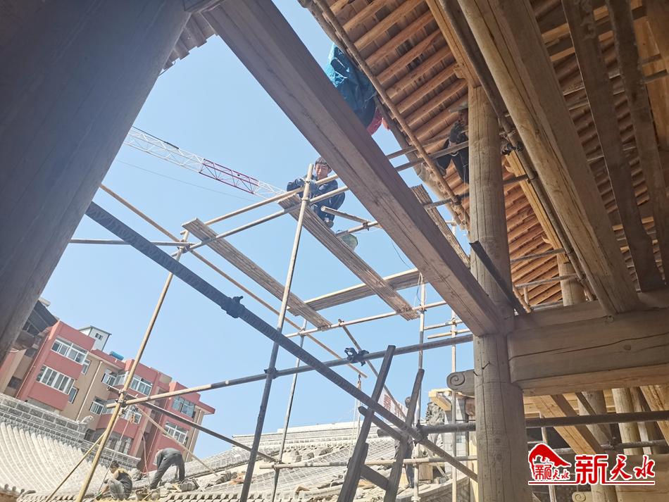 5月7日,在天水古城西關(guān)片區(qū)綜合保護(hù)與利用項(xiàng)目自由路片區(qū)的施工現(xiàn)場,工人們正在進(jìn)行屋脊、廊柱、門窗等部分的修繕施工。