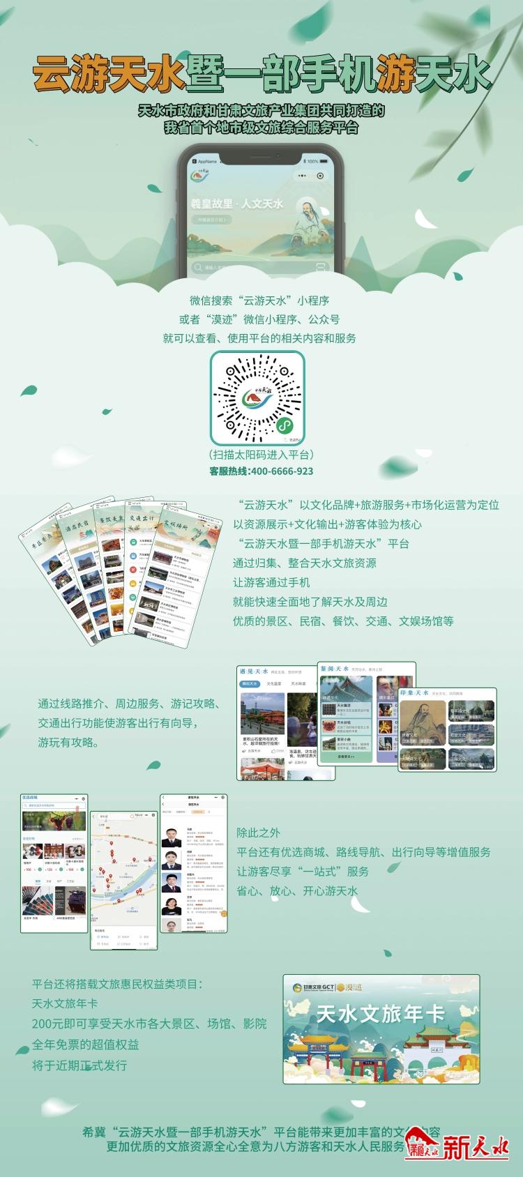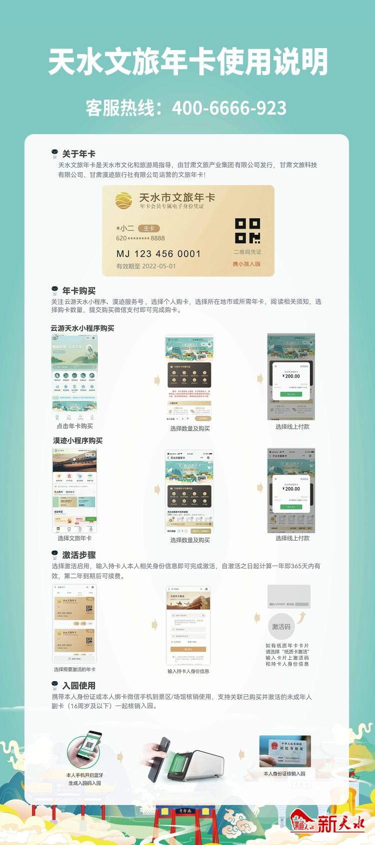 新天水訊【記者王瑩】“一卡在手,游遍天水?!?月22日,便民惠民的天水文旅年卡正式上線發(fā)行,市民只需支付200元辦卡,就可在一年之內(nèi)享受暢游景區(qū)景點、暢享場館、影院的超值優(yōu)惠。那么,天水文旅年卡到底怎么辦理呢?