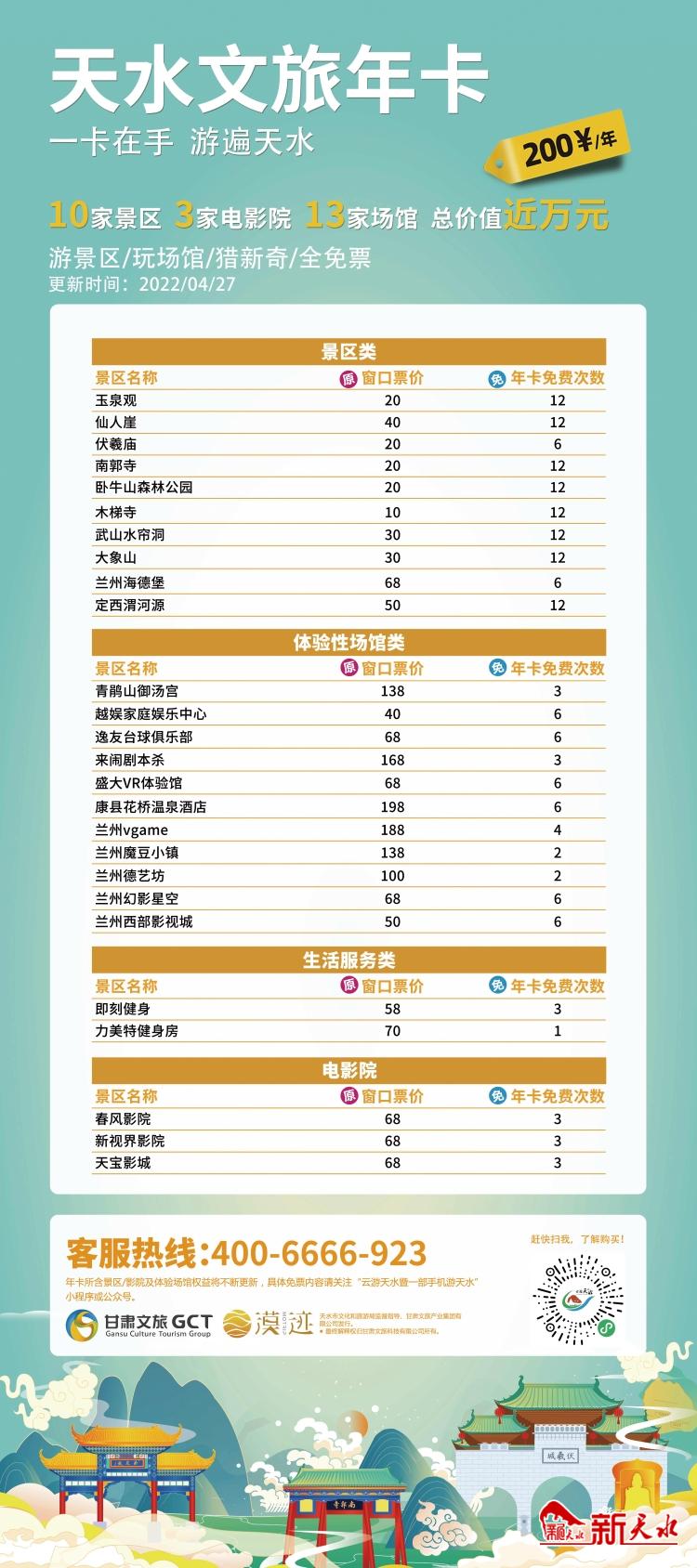 看到如此超值的諸多優(yōu)惠,您是不是心動了呢?趕快行動起來吧!天水文旅年卡客服熱線:400—6666—923。