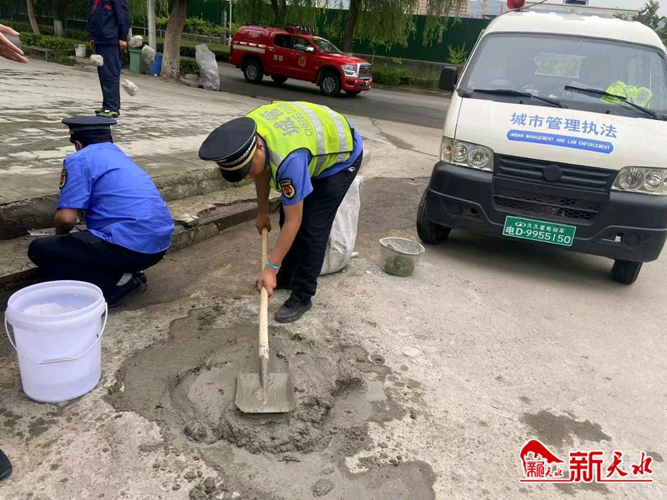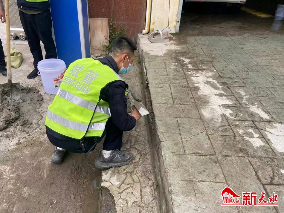 藉河南路迎賓橋周邊臺階破損與塌陷,阻礙了市民正常通行也存在較大的安全隱患,而且破損的臺階也影響市容市貌的美觀,該中隊隊員在告知周圍群眾繞道通行的同時,立即著手準(zhǔn)備工具,對此處破損臺階進(jìn)行修補。中隊隊員以精、細(xì)、美為原則親自上手,在抬水泥、和水泥、修復(fù)、抹平等一系列操作后,破損的臺階恢復(fù)整潔面貌,在消除安全隱患的同時提升市容市貌。