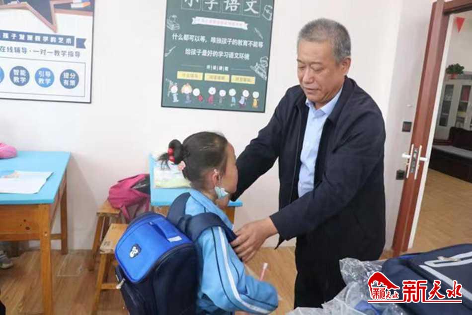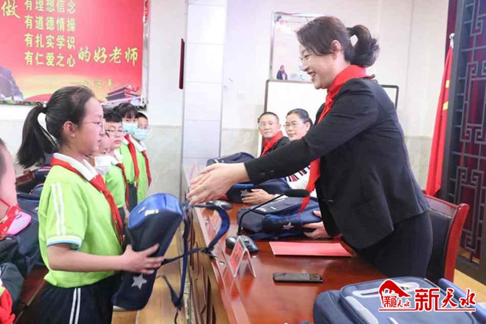 慰問組一行先后深入甘谷縣大像山鎮(zhèn)柳湖小學(xué)、甘谷縣翔隆強制衣廠職工子女托管班,為學(xué)生們送上書包、文具盒、跳繩、紅領(lǐng)巾等愛心禮包,并提前送上節(jié)日的問候和美好的祝福?!?/p>