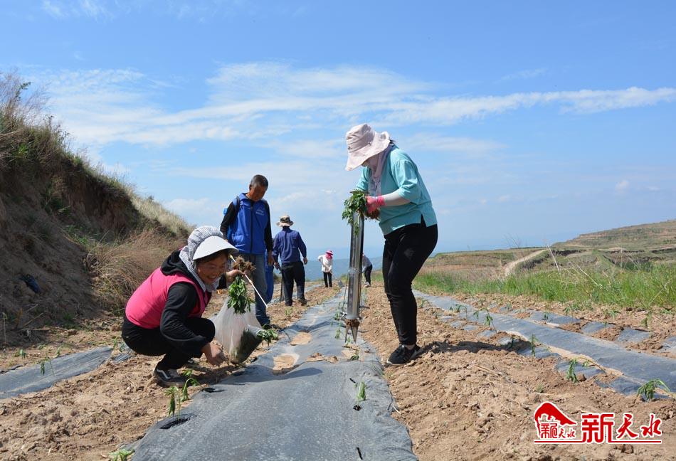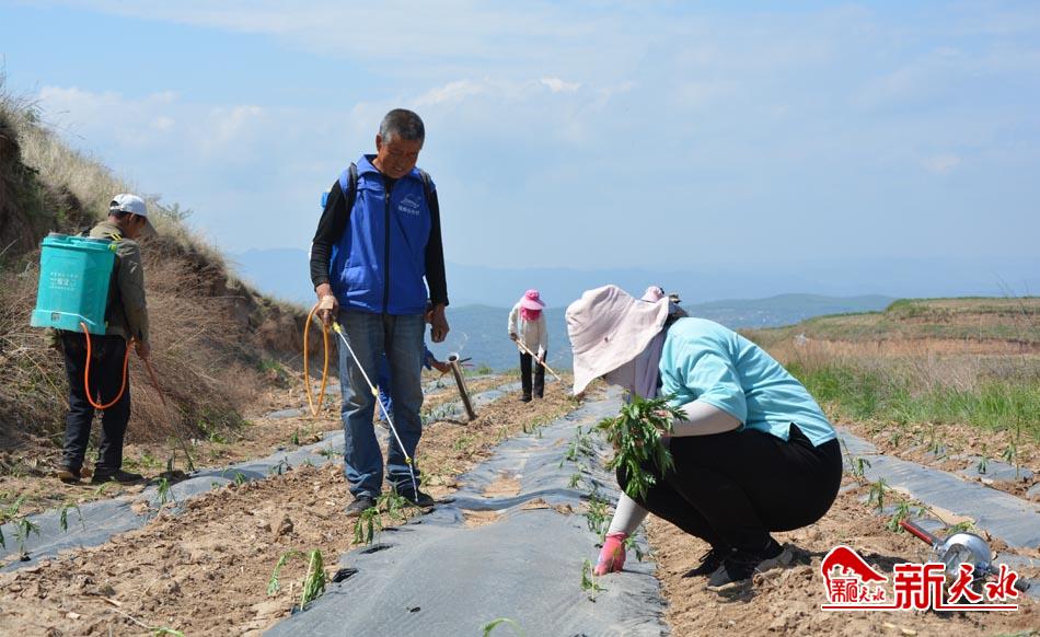 初夏時(shí)節(jié),清水大地生機(jī)勃勃。在郭川鎮(zhèn)馬廟梁千畝萬(wàn)壽菊種植示范點(diǎn),一條條覆膜帶在陽(yáng)光照射下閃閃發(fā)光。放眼望去,漫山遍野的黑色覆膜帶整齊劃一,頗具規(guī)模。群眾在地里忙著移栽萬(wàn)壽菊,一片繁忙景象。