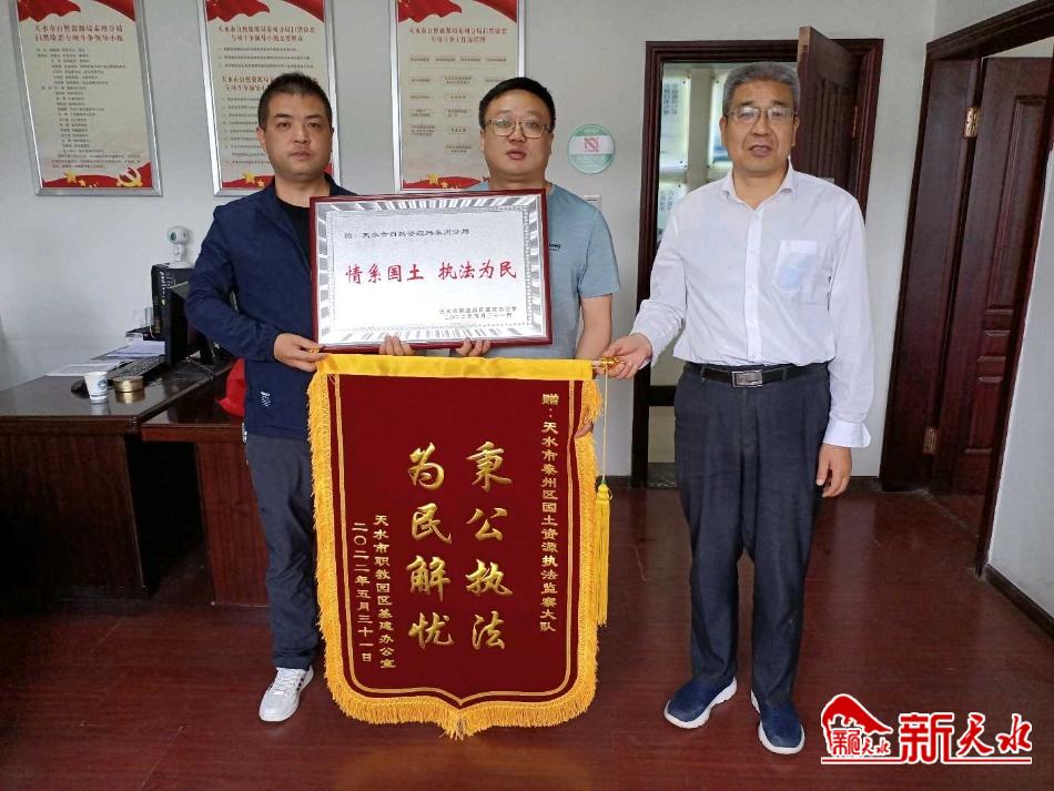 6月2日,天水市職教園區(qū)基建辦公室向天水市自然資源局秦州分局贈(zèng)送了“秉公執(zhí)法,為民服務(wù)”的錦旗和“情系國(guó)土,執(zhí)法為民”的牌匾,以感謝該局長(zhǎng)期以來(lái)對(duì)他們提供的優(yōu)質(zhì)服務(wù)和幫助。
