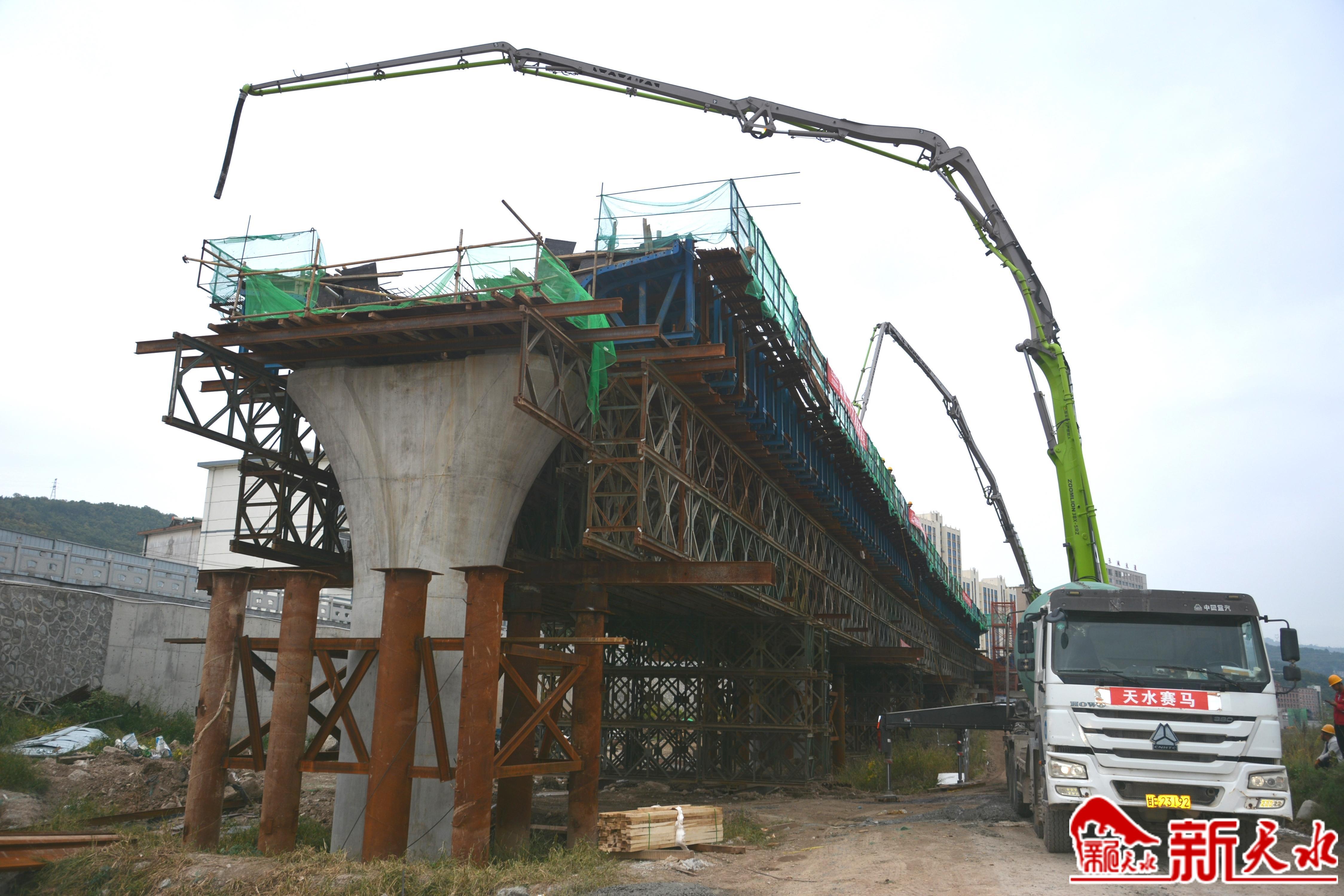記者在秦州區(qū)迎賓橋附近看到,施工人員正在吊裝鋼管支架,為貝雷梁安裝做準備。在五里鋪大橋以西,藉河特大橋72號至75號墩臺的現(xiàn)澆箱梁施工正在火熱進行中,從早上7時30分開始,要連續(xù)不間斷作業(yè)至晚6時30分左右,施工人員吃飯都在澆筑現(xiàn)場。這座預應力砼現(xiàn)澆箱梁為一聯(lián)三跨,全長90米,設計混凝土545方,兩臺混凝土泵車同時澆筑,需要11個小時才完成澆筑。