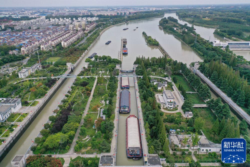 ↑貨船通過(guò)京杭大運(yùn)河江蘇泗陽(yáng)船閘(2022年9月25日攝,無(wú)人機(jī)照片)。新華社發(fā)(方東旭 攝)
