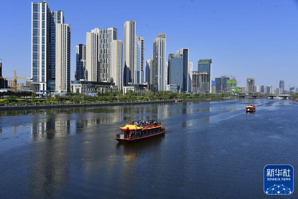 ↑游船駛過(guò)位于北京市通州區(qū)的運(yùn)河商務(wù)區(qū)(2020年4月26日攝,無(wú)人機(jī)照片)。新華社發(fā)(常鳴 攝)