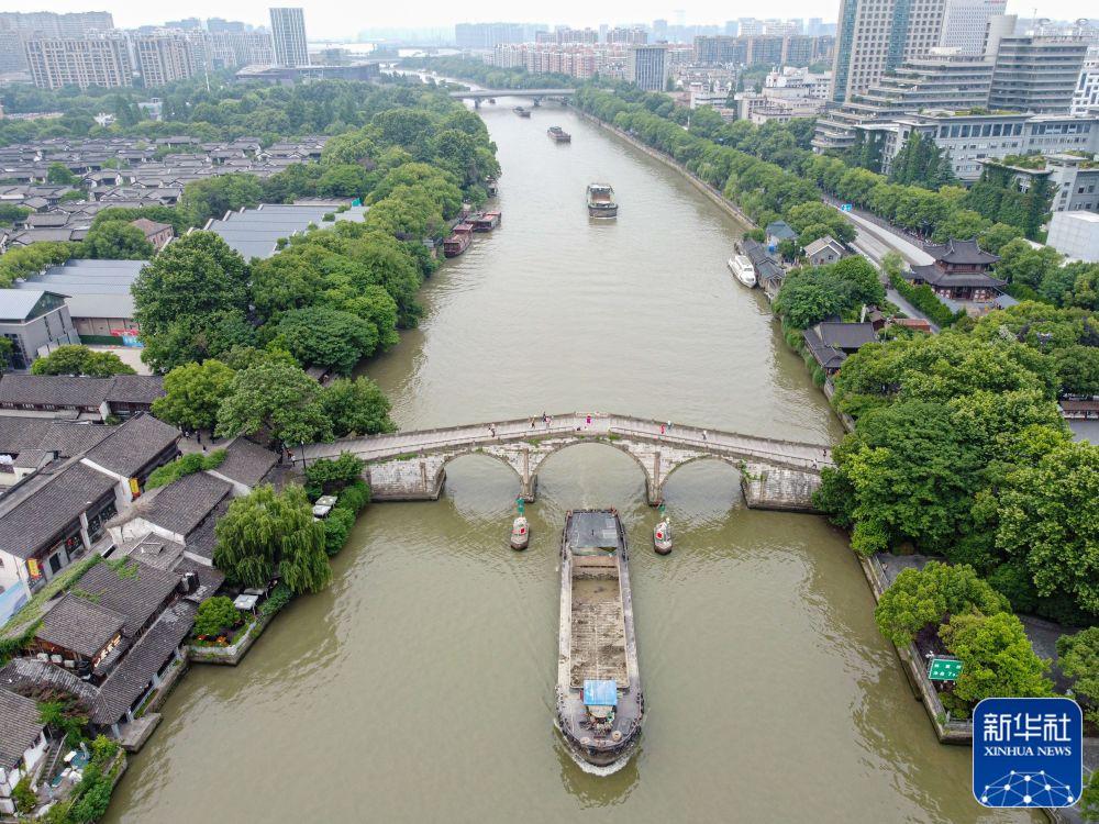 ↑行駛在大運(yùn)河上的貨船通過(guò)杭州拱宸橋(2022年5月27日攝,無(wú)人機(jī)照片)。新華社記者 江漢 攝