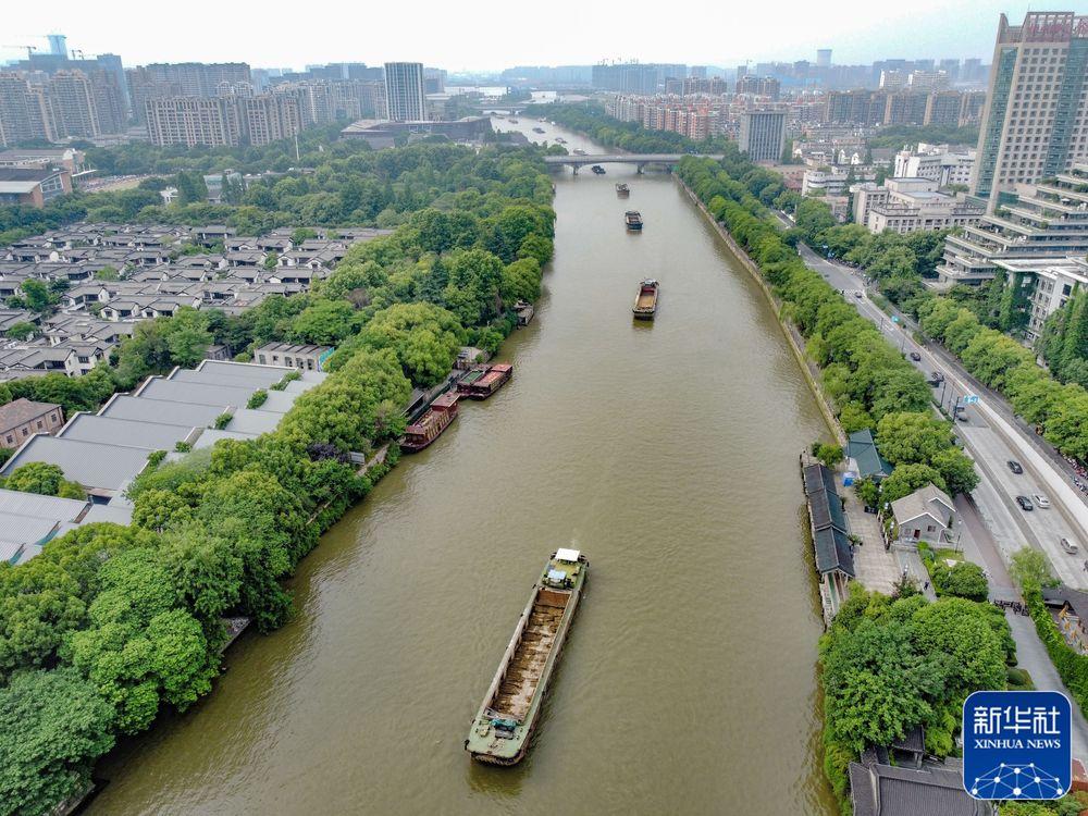 ↑貨船行駛在大運(yùn)河杭州段(2022年5月27日攝,無(wú)人機(jī)照片)。新華社記者 江漢 攝