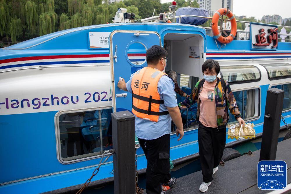 ↑居住在大運(yùn)河周邊的杭州市民乘坐“運(yùn)河”號(hào)水上巴士出行(2022年9月29日攝)。新華社記者 江漢 攝