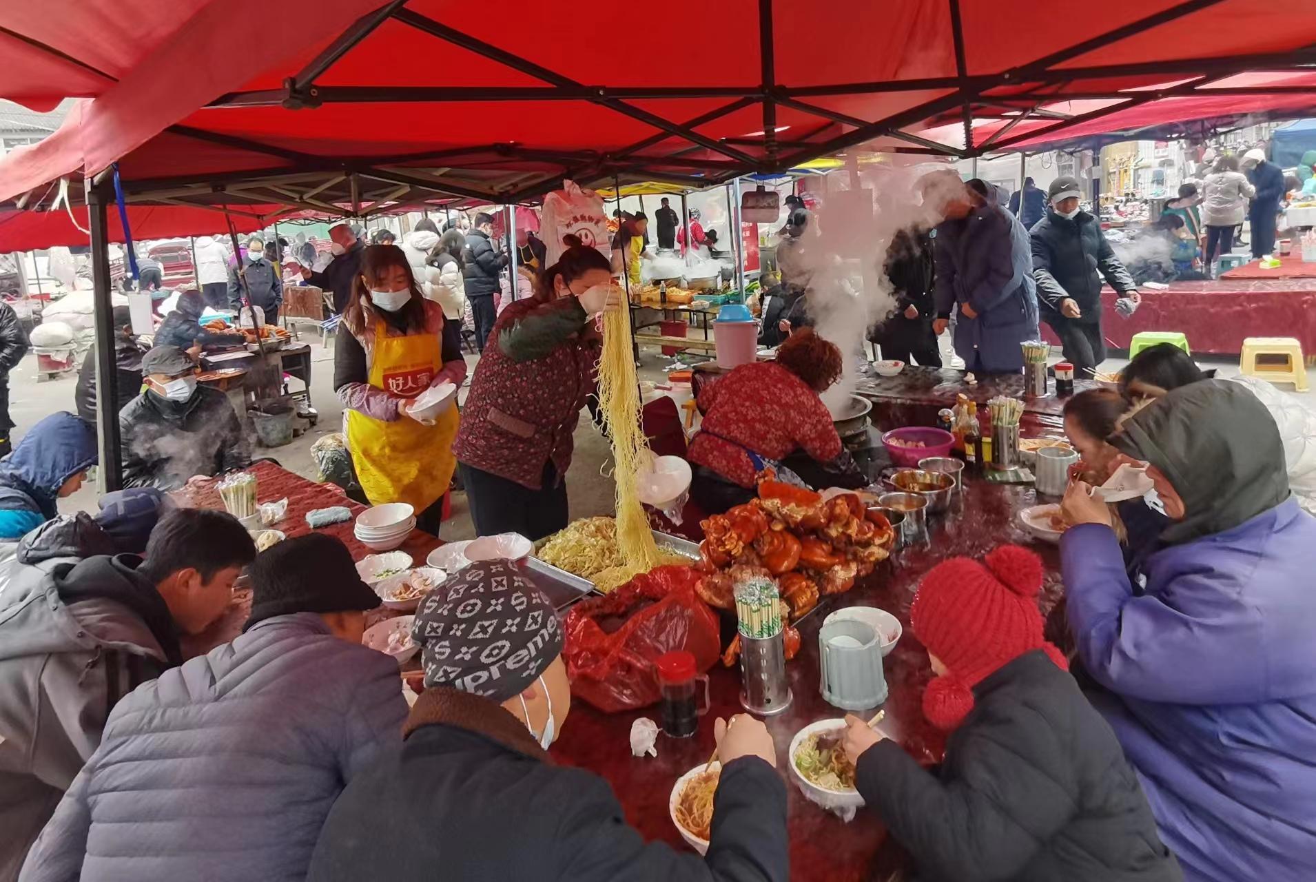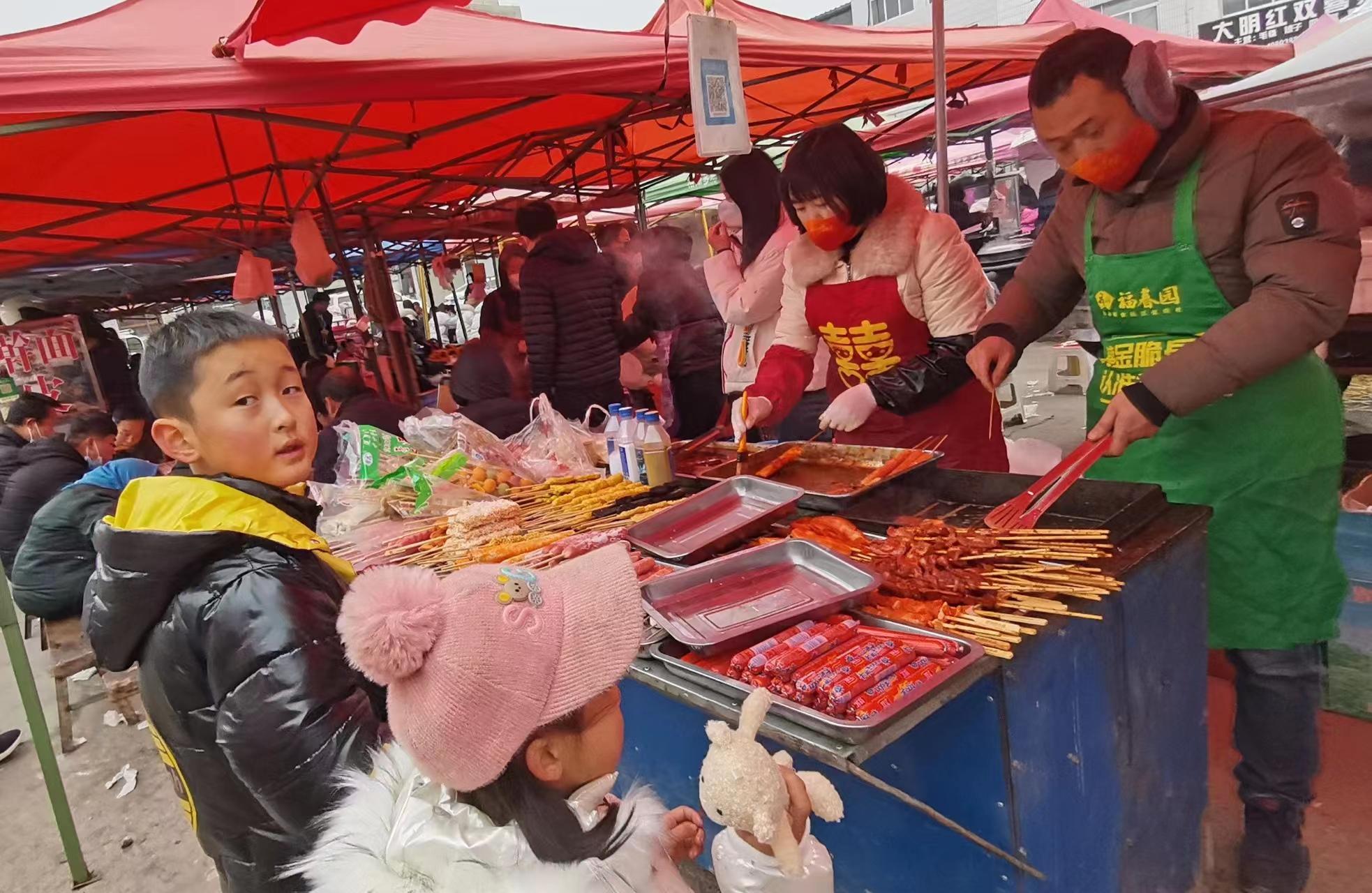 瞧!紅火熱鬧的集市上人如潮涌,各類貨品琳瑯滿目,鞋服、被單、燈籠、福字、對(duì)聯(lián)、干果、大肉、鮮魚(yú)、調(diào)料、各種果蔬等樣樣齊全,還有那冒著熱氣的小籠包、現(xiàn)場(chǎng)制作的棉花糖、剛撈出鍋的炸油餅、熱氣騰騰的香肉面、小朋友手中的年畫(huà)和氣球、人們喜氣洋洋的笑臉……一幅幅喜慶歡鬧的場(chǎng)面,融化了飄飛的雪花,驅(qū)散了凜冬的寒氣。煙火氣濃郁的小年鄉(xiāng)鎮(zhèn)年集,讓飽含著鄉(xiāng)情的濃濃年味撲面而來(lái)。新天水記者 王瑩 攝