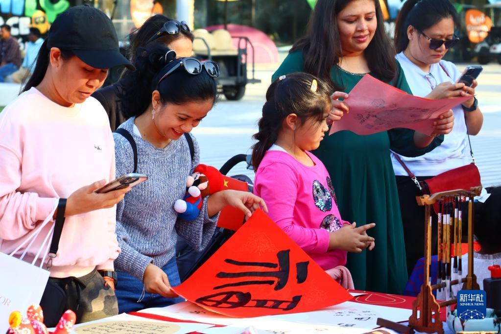 在傳統(tǒng)中國年俗里,逛廟會是必不可少的,迪拜世博城設(shè)有琳瑯滿目的春節(jié)集市。民眾在這里可以品嘗各種美食,參加有趣的小游戲,觀賞春節(jié)文化主題的手工藝品,現(xiàn)場還有書法愛好者為人們書寫“?!弊?。