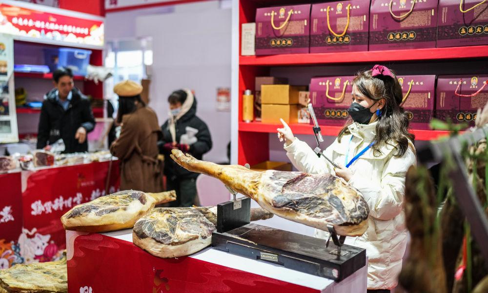 1月15日,在貴陽市南明區(qū)蘭花廣場年貨節(jié)現(xiàn)場,工作人員在使用手機(jī)直播進(jìn)行線上銷售。新華社記者 陶亮 攝