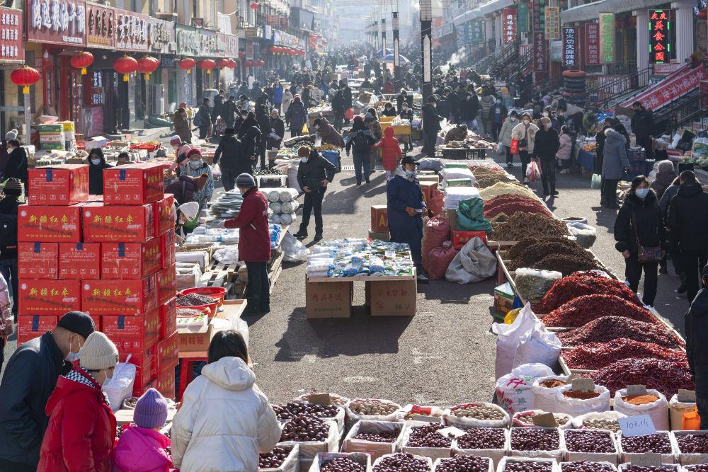 1月12日,市民在綏芬河市龍須溝步行街的年貨大集上選購年貨。新華社記者 謝劍飛 攝