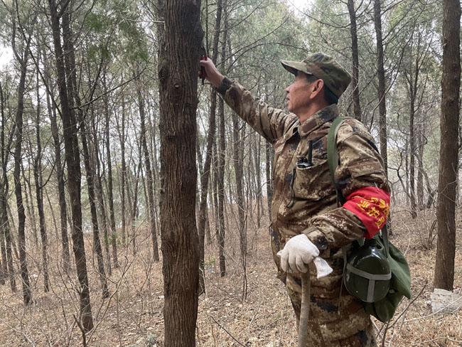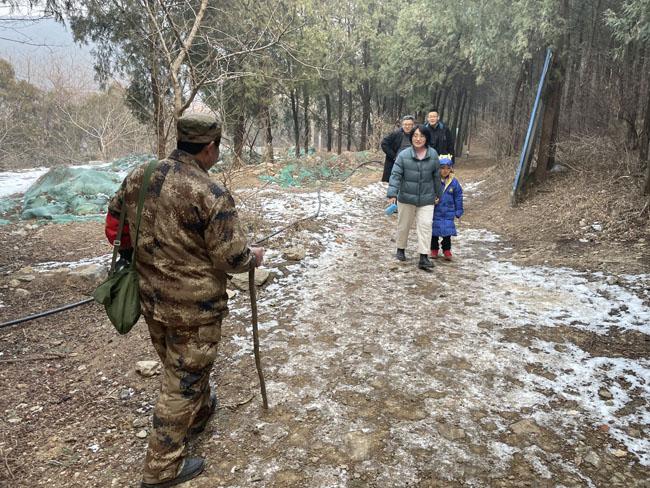 “巡山第一要務(wù)就是防火?!贝汗?jié)是巡查巡護的關(guān)鍵期,大年初一有不少市民選擇登高爬山。劉采法在巡山的途中遇到游客總是多叮囑幾句:“注意安全,嚴禁帶火種上山?!碑?dāng)他看到柏樹上纏著的枯草時趕緊上前用剪刀剪掉?!斑@是為了防止枯草引燃樹木,這片林子里側(cè)柏多,樹本身分泌油脂,燃點低,一旦有火源,枯草容易把火引到樹干上,到時候很難控制火情?!睘榱吮WC游客通行安全,他還不時拿著剪子剪掉山路上伸出來的枯枝死枝。