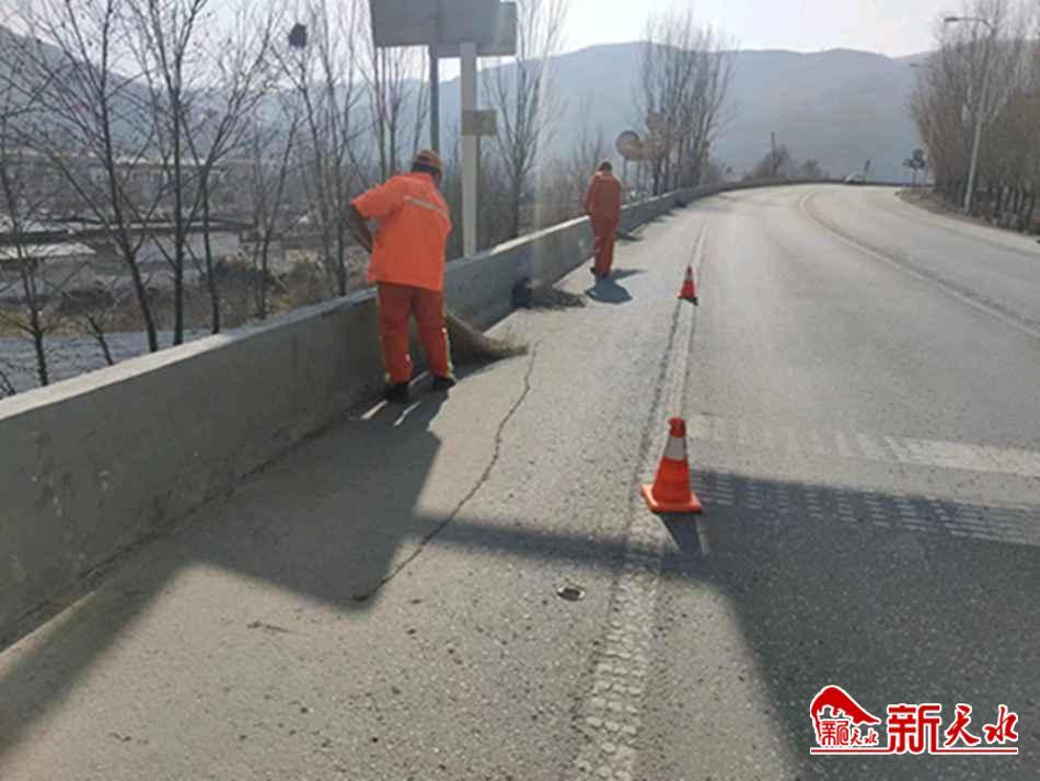 新天水訊【通訊員張?zhí)碚洹楷F(xiàn)在正值節(jié)后返城高峰期,車流量大,為保障人民群眾安全出行,清水公路段開展了節(jié)后公路路域環(huán)境整治工作。