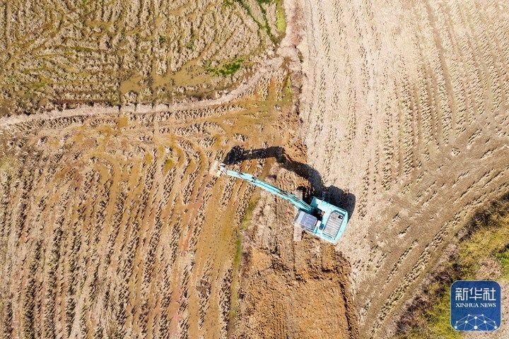 1月29日,在江西省撫州市金溪縣秀谷鎮(zhèn)五里村高標(biāo)準(zhǔn)農(nóng)田建設(shè)現(xiàn)場,施工人員開動(dòng)機(jī)械設(shè)備建設(shè)高標(biāo)準(zhǔn)農(nóng)田。新華社發(fā)(鄧興東攝)