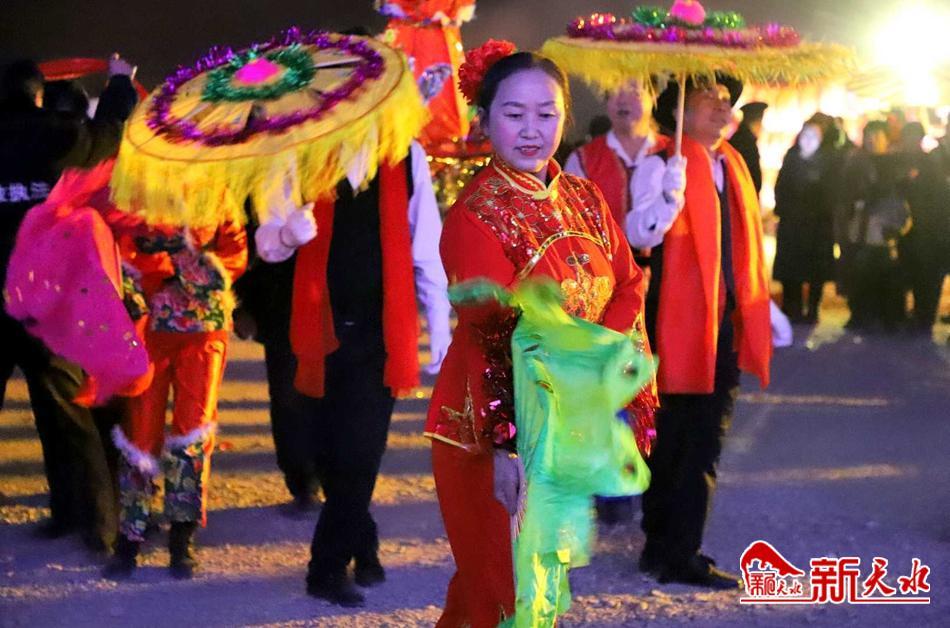 新天水訊 1月31日晚,正月初十,武山縣寧遠(yuǎn)古堡文化產(chǎn)業(yè)園黑虎堡內(nèi)張燈結(jié)彩,鑼鼓喧天,人聲鼎沸。這里正在進(jìn)行舞龍舞獅子、劃旱船、扭秧歌等各種民俗社火的展演,一派熱鬧的歡樂景象。